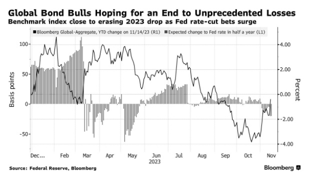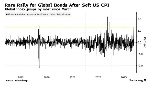 这一追踪超过61万亿美元的全球债券指数大幅走高,主要是因为美国通胀数据促使交易员取消对美联储进一步加息的押注,并增加了对降低借贷成本的押注。疲软的通胀数据还表明,一代人以来最激进的紧缩周期将使全球经济放缓,并推动各大央行在2024年降息。