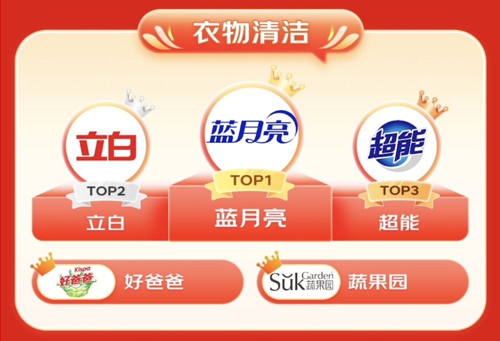据京东双11家清全时期战报显示,10月23日20:00至11月11日24:00全时期,京东家清50大品牌销售破千万,巅峰28小时购买用户破百万。其中,蓝月亮品牌持续霸榜,稳居衣物清洁品类销售榜第一。