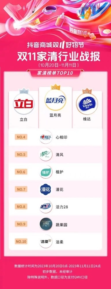 根据抖音商城双11好物节(10月20日-11月11日)排行榜,蓝月亮稳居双11家清行业家清榜单TOP 1,并摘得家清巅峰品牌榜、巅峰店铺榜双冠,蓝月亮洁净洗衣液夺得好物商品榜No.1。