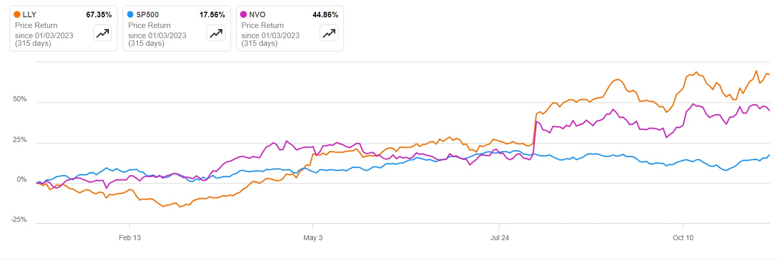 今年迄今为止,诺和诺德和礼来的股价在美股市场的涨幅分别高达45%和67%,大幅跑赢美股基准股指——标普500指数。