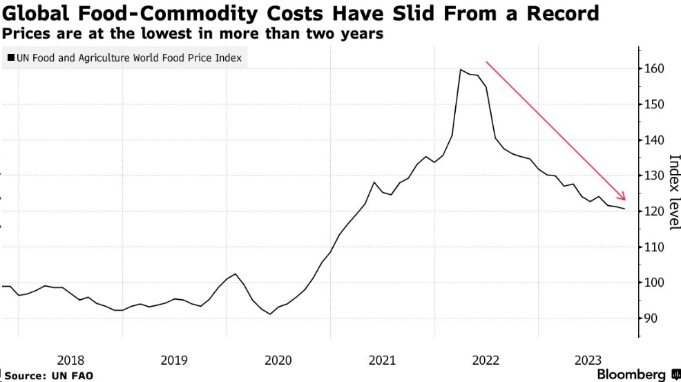 在经历新冠疫情、极端天气和俄乌冲突所导致的动荡之后,食品类大宗商品价格正在企稳。联合国衡量全球食品成本的指标自2022年3月创下纪录以来已下滑约25%,有助于降低整体通胀。但这需要时间才能渗透到超市,因为超市面临着高昂的能源和劳动力成本。