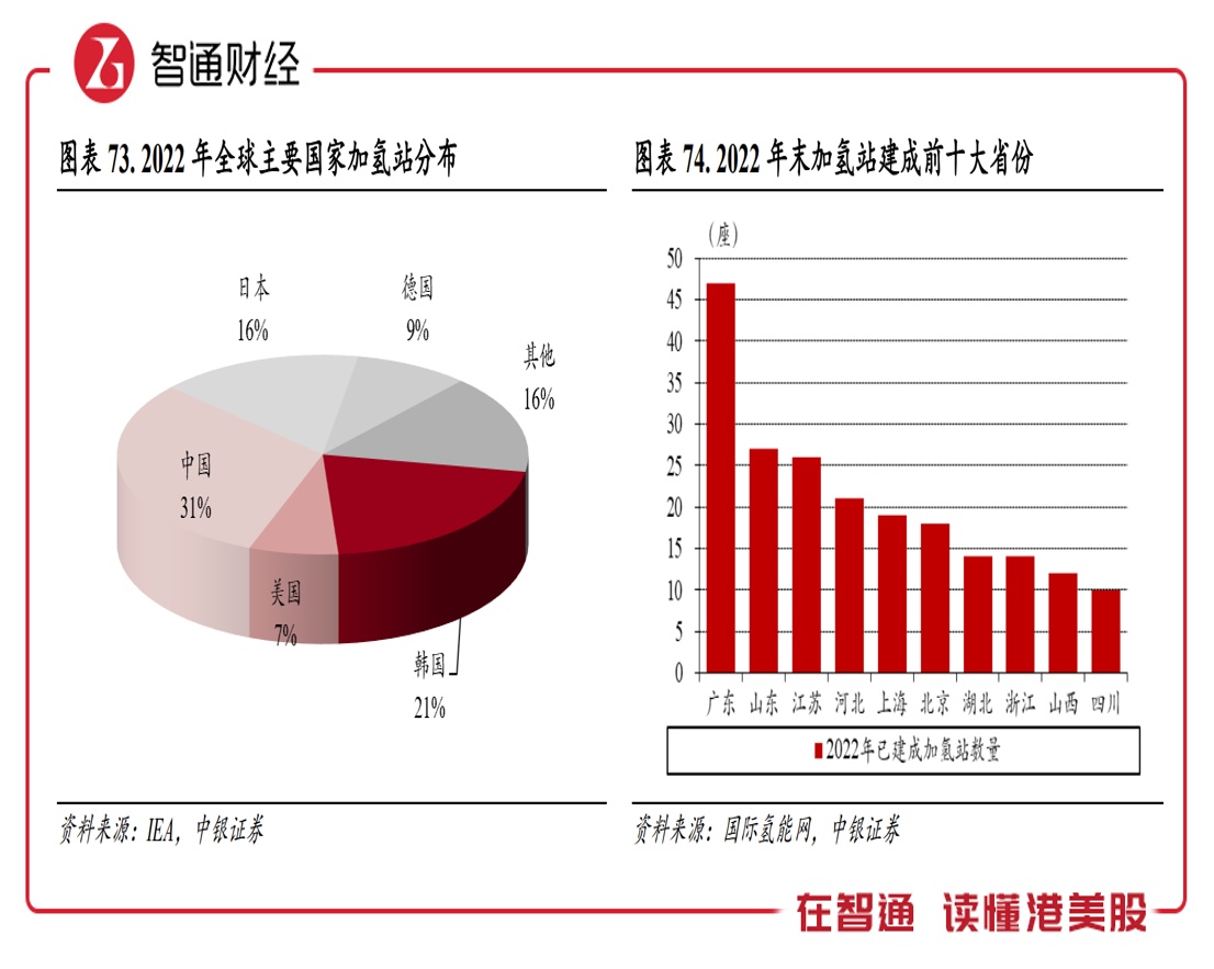 储运氢环节就卡住了行业发展的脖子,而加氢站建设的落后则限制了行业发展空间,加氢站和加油站及充电桩一样,都是补能基建,建设成本较高,但没有补能基建,车就成了废铁。根据H2stations发布的加氢站统计数据,截止2022年年底,全球共有814座加氢站投入运营,而中国有310座,占比38.1%。