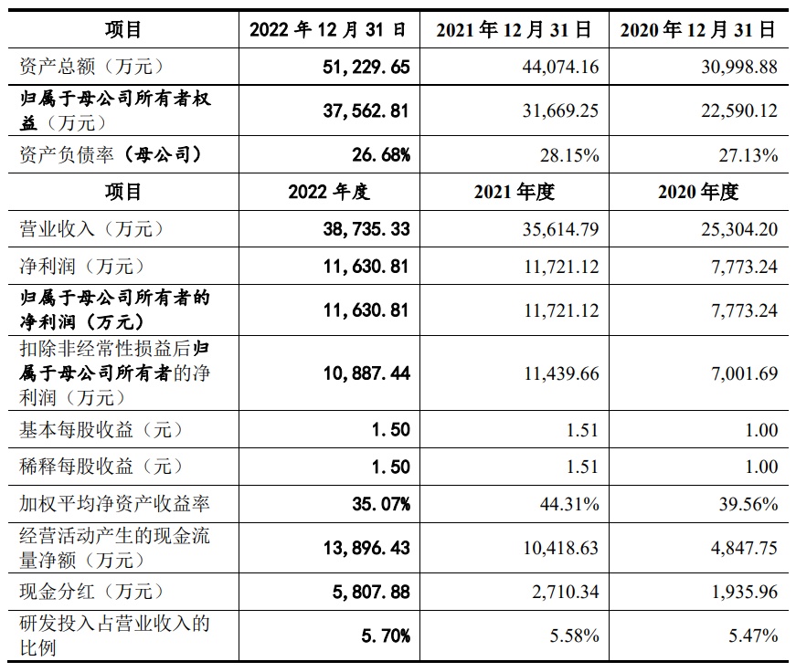 财务方面,于2020年度、2021年度及2022年度,公司实现营业收入分别约为2.53亿元、3.56亿元、3.87亿元。公司净利润分别约为7773.24万元、1.17亿元、1.16亿元人民币。