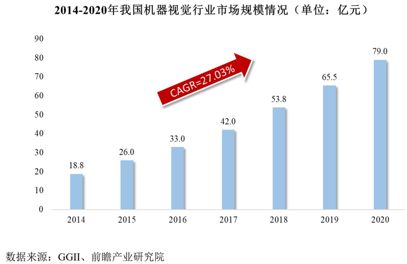 根据前瞻产业研究院数据,2020年中国机器视觉市场规模79亿元,同比增长20.61%。2014-2020年复合增长率为27.03%,行业整体增速较快。