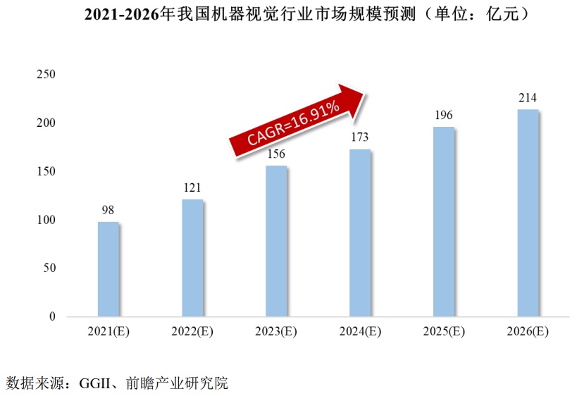 未来几年内,受益于机器视觉技术在工业自动化、智能制造等应用领域的需求提升、国内机器视觉企业自主研发能力增强、进口替代及出口规模进一步提升、产品应用领域进一步拓宽、国内经济形势持续稳定向好等驱动因素,机器视觉行业市场规模有望持续增长。根据前瞻产业研究院研究数据,预计国内机器视觉行业市场规模将由2021年的98亿元提升至2026年的214亿元,年均复合增长率约为16.91%。