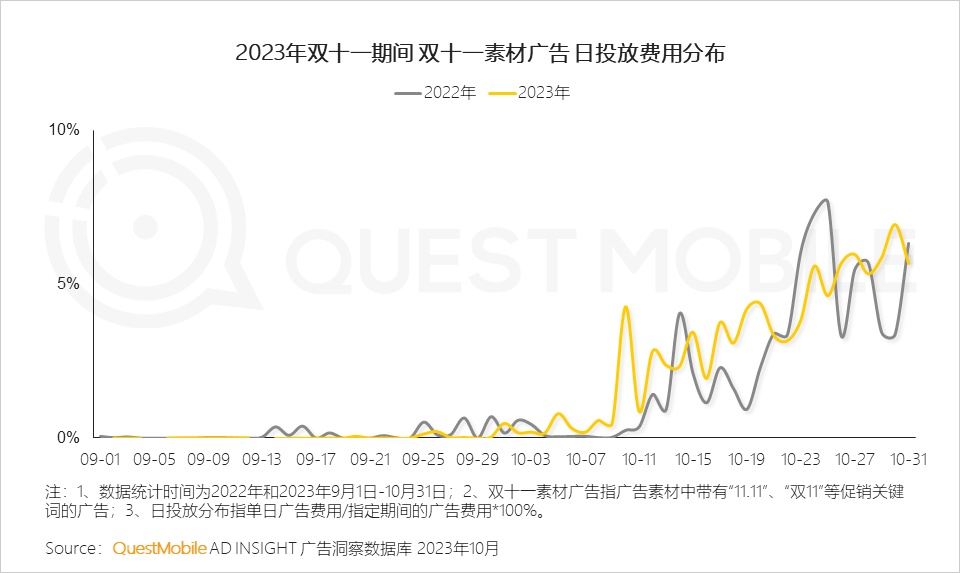 双十一广告投放相比去年略有前置,十一假期之后开始出现较为明显的广告素材投放。