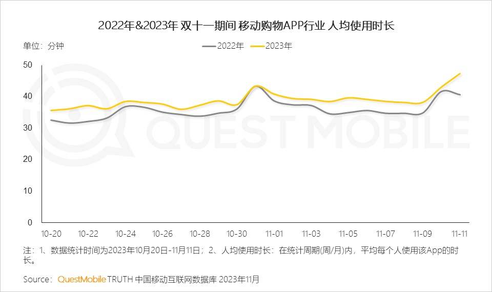 QuestMobile数据显示,2023年双11阶段,移动购物APP行业单日人均使用时长约为38.9分钟,比去年同期的35.9分钟上涨约8.4%。