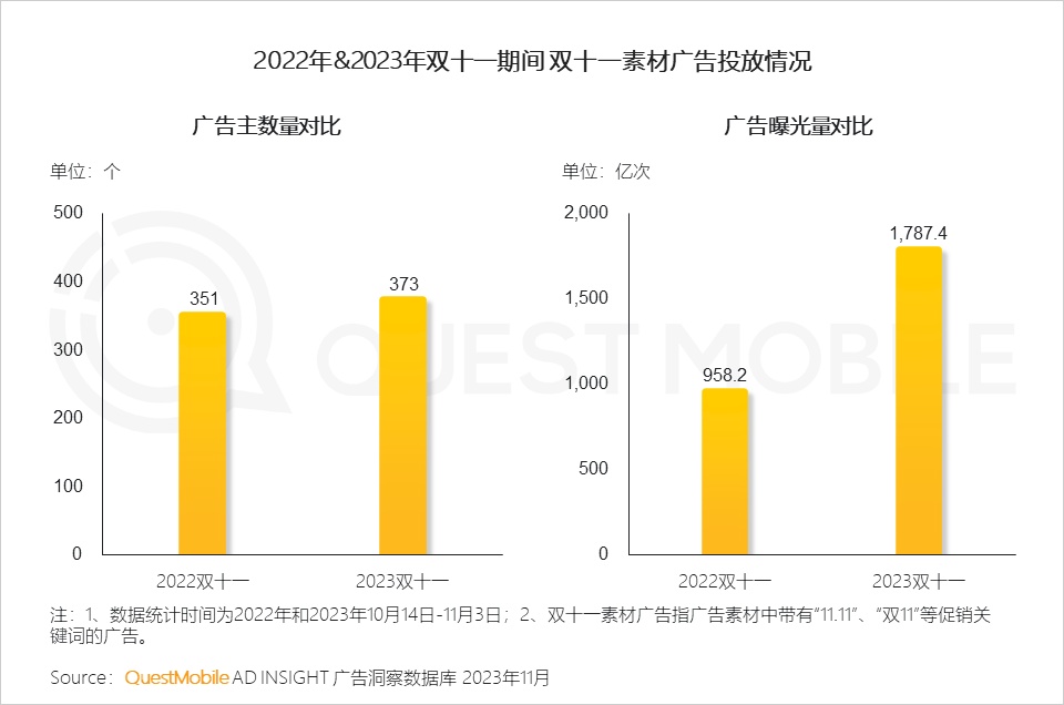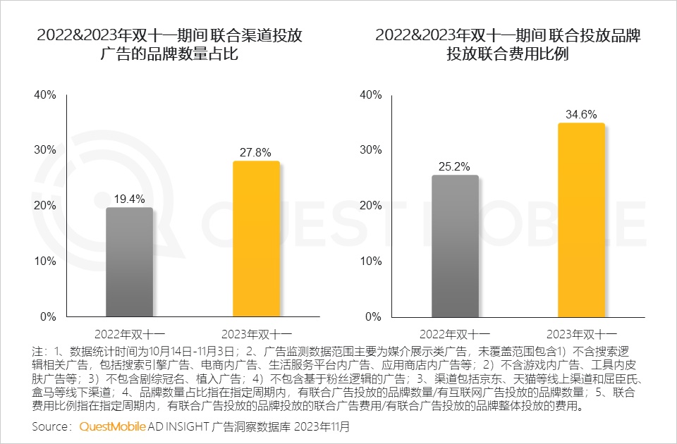 QuestMobile数据显示,2023年双十一近三成品牌进行联合渠道广告投放。