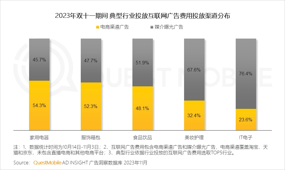 QuestMobile数据显示,2023年双十一家用电器和服饰箱包行业投放的互联网广告中,投向电商内的广告费用占比均超过50%。