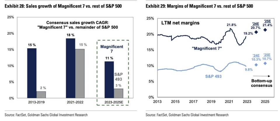 Kostin写道:“从基本面来看,近年来的盈利轨迹解释了这七家公司相对于市场其他公司的表现。‘壮丽七巨头’今年表现优异的同时,利润率和盈利的反弹超过了市场其他板块的疲软。市场普遍预期,‘壮丽七巨头’将继续实现比该指数其他成份股更快的增长。”