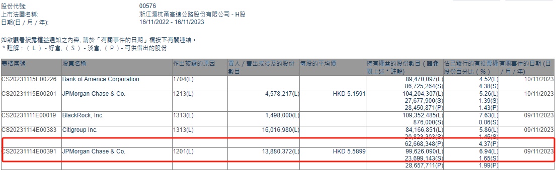 智通财经APP获悉,香港联交所最新资料显示,11月9日,小摩减持浙江沪杭甬(00576)1388.0372万股,每股作价5.5899港元,总金额约为7758.99万港元。减持后最新持股数目约为9962.61万股,最新持股比例为6.94%。