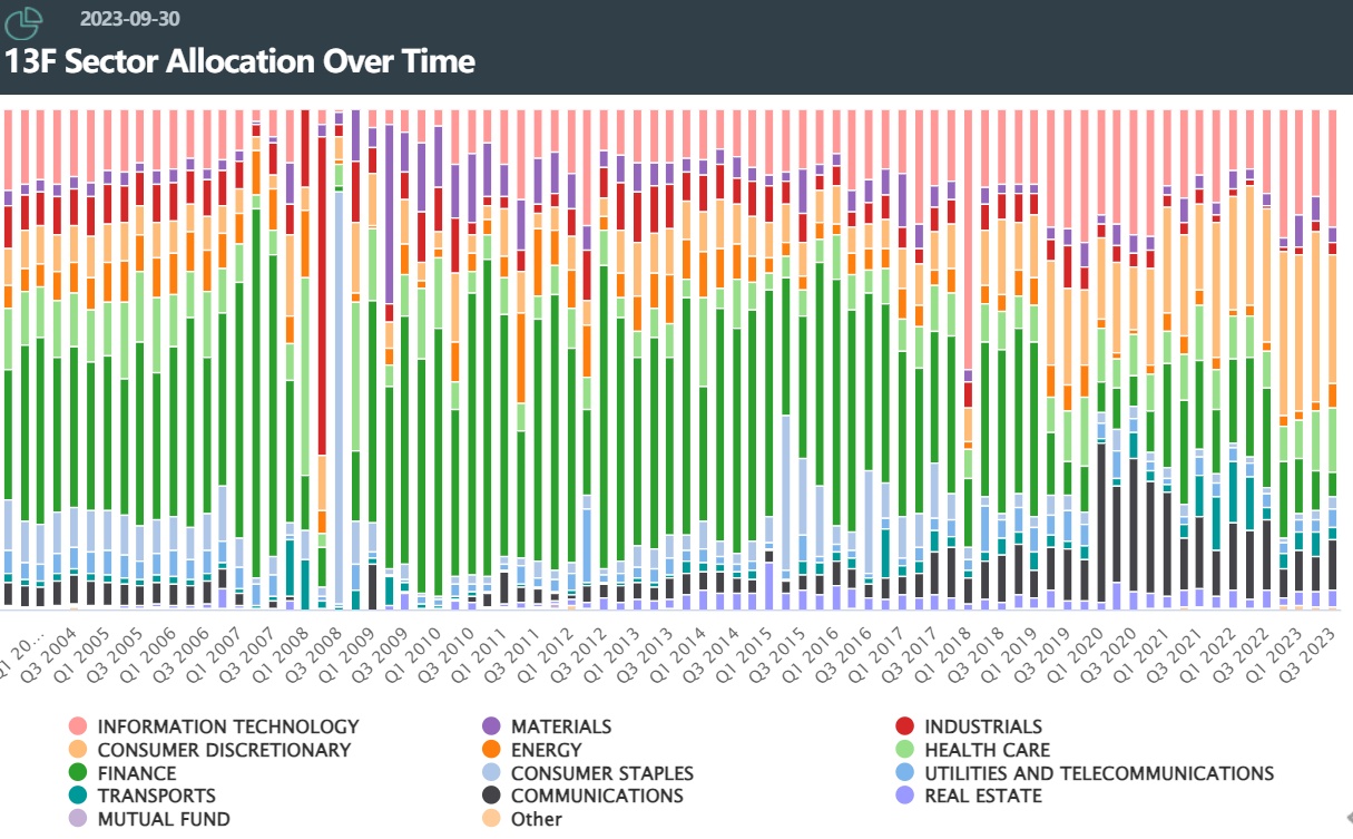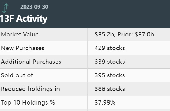 最新数据显示,野村Q3持仓总市值为352亿美元,上一季度则为370亿美元,环比下降近5%。野村在Q3的投资组合中新增了429只标的,增持339只标的,减持386只标的,清仓395只标的;其中前十大持仓标的占总市值的37.99%,持仓相对集中。