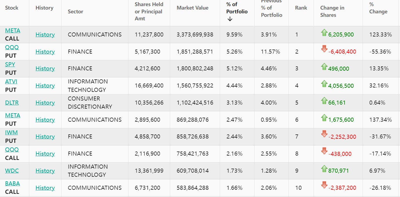 其中,Facebook和Instagram母公司Meta Platforms(META.US)看涨期权位列第一,持仓约1124万股,持仓市值约34亿美元,占投资组合比例为9.59%,持仓数量较上季度暴增123.33%。Meta看跌期权也获野村大幅增持,增持幅度较上季度暴增137.34%,该看跌期权位列野村第六大重仓行列。