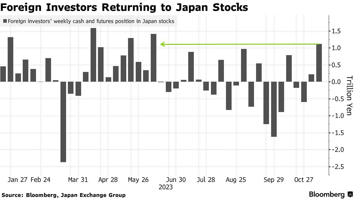 日本交易所集团(Japan Exchange Group Inc.)的统计数据显示,外国投资者在上周净买入高达1.1万亿日元(大约72.7亿美元)现金股票和股指期货,这是截至6月9日当周以来最大规模的周度资金流入,在6月份日经225指数创下1989年以来的新高。上周,美国申领失业救济人数显示劳动力市场疲软,CPI和PPI显示通胀大幅放缓,加之任天堂公司和东京电子等大型蓝筹公司大幅提高利润预期,刺激日本股市大幅上涨。