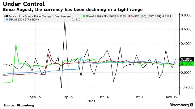 虽然土耳其里拉一直在贬值,在过去三个月里几乎每天都在延续创纪录的低点,但其每日跌幅一直被控制在一个非常狭窄的范围内,平均仅略高于0.1%。其结果是,一个月隐含波动率(衡量货币预期价格波动的指标)本月跌破10%,接近今年最低水平。