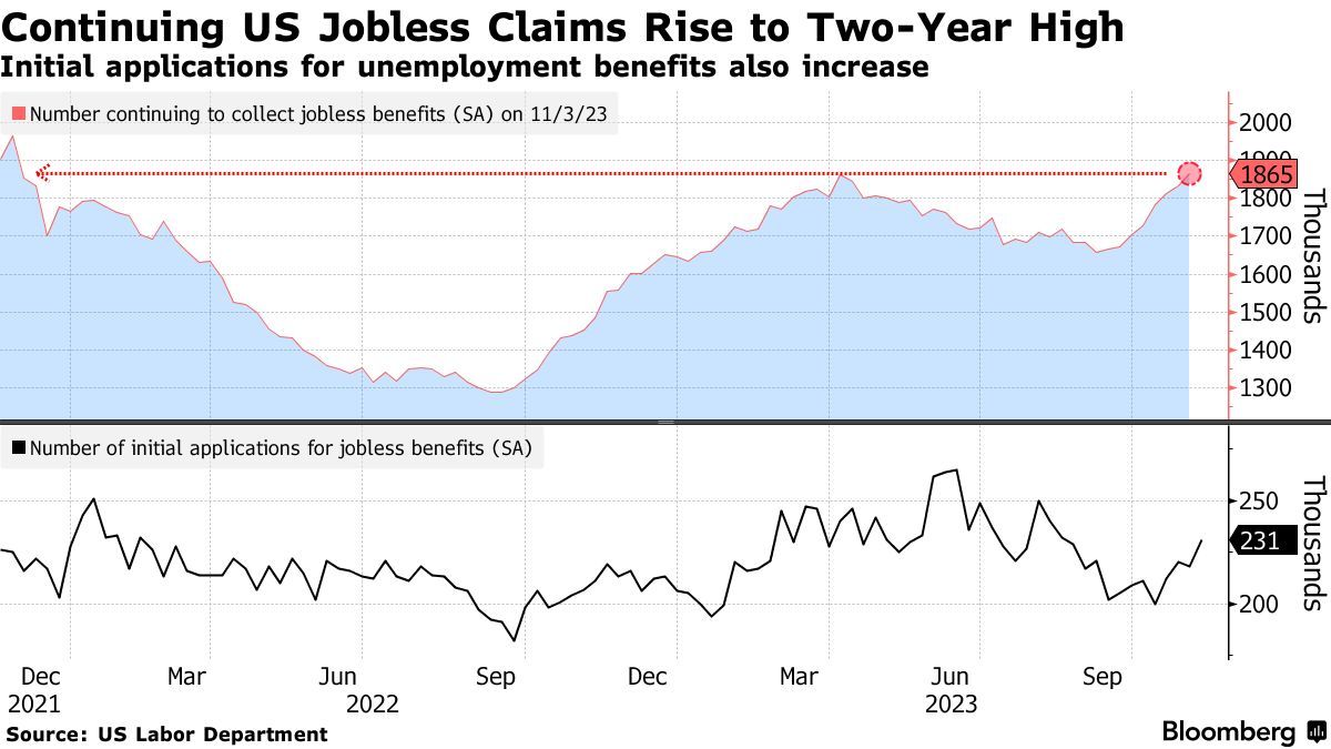 智通财经APP获悉,美国连续申请失业救济金人数升至近两年来的最高水平,凸显出失业工人在寻找新工作时面临越来越艰难的挑战。美国劳工部(Labor Department)周四公布的最新数据显示,截至11月4日当周,连续申领失业救济金的人数跃升至187万人,远高于前值,且连续八周上涨,凸显美国劳动力市场裂痕愈发明显。截至11月11日当周,首次申请失业救济金人数也上升至23.1万人,超过经济学家们普遍预期的22万人,同时也是自8月以来的最高水平。