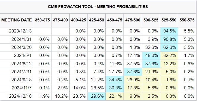 暗示美国劳动力市场降温以及薪资增幅也可能降温的最新续请失业金数公布后,CME“美联储观察工具”显示,利率期货交易员们押注美联储加息周期已完结,对于美联储明年5月开始降息周期的预期迅速升温,押注自5月以来美联储将降息近100个基点。
