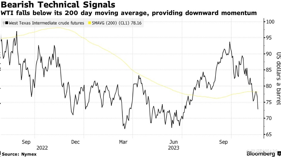 智通财经APP获悉,国际油价暴跌至7月以来的最低水平,因为趋势交易加剧了库存增加和关键技术支撑位失守引发的跌势。布伦特原油价格下跌4.6%,收于每桶78美元下方,此前受算法驱动的交易员在油价跌破80美元时抛售了原油头寸。WTI原油价格下跌4.9%,收于每桶73美元下方,跌破了200日移动均线,此前公布的报告显示美国原油库存上升。