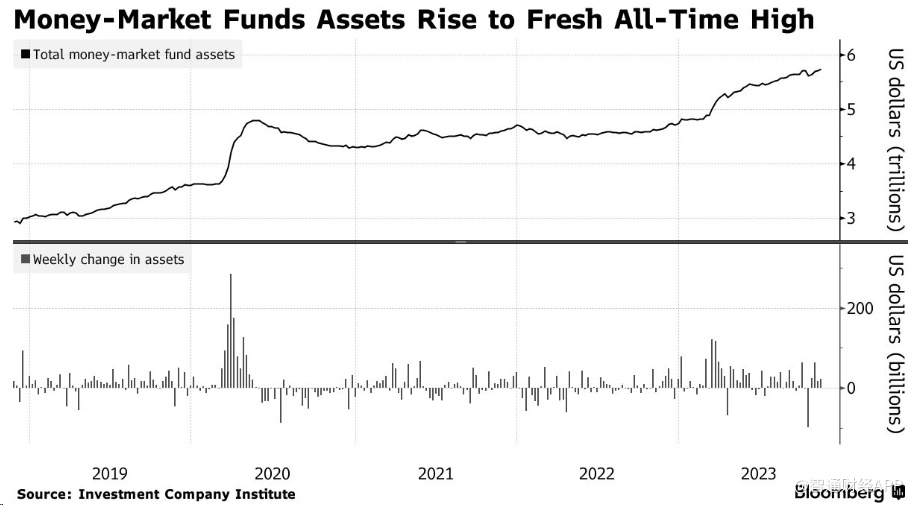 自去年美联储启动数十年来力度最大的紧缩周期之一以来,投资者就一直涌入货币基金。基金经理比银行更快地将高利率带来的好处转移给投资者。