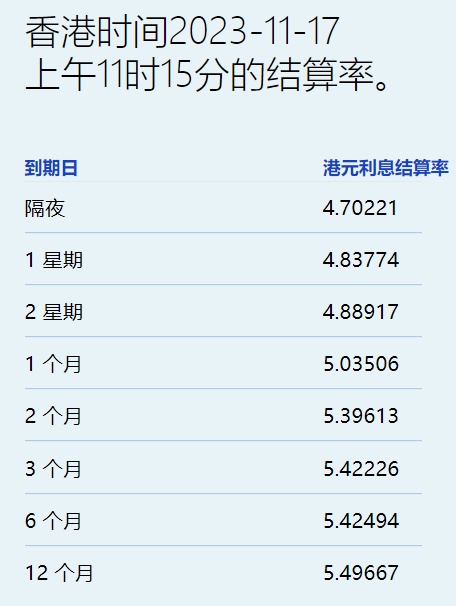 智通财经APP获悉,11月17日,港元拆息全线上扬,其中,隔夜息结束四连跌,反弹近38基点至4.70221%,创逾一个月新高,而与楼按相关的一个月拆息亦重上5%水平,报5.03506%,见一个月新高。三个月拆息升至5.42226%,为8月2日以来最高,与同期美元LIBOR息差收窄至21基点。长息方面,六个月及一年期分别报5.42494%和5.49667%。