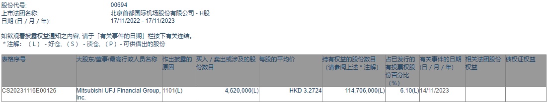 Inc.增持北京首都机场(00694)462万股,每股作价3.2724港元,总金额约为1511.85万港元。增持后最新持股数目为1.15亿股,最新持股比例为6.10%。
