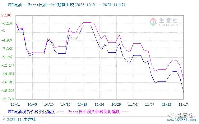 智通财经APP获悉,据生意社消息,11月16日,国际原油期货重挫。美国WTI原油期货主力合约结算价报72.90美元/桶,跌幅为3.76美元或4.9%。布伦特原油期货主力合约结算价报77.42美元/桶,跌幅3.76美元或4.6%。究其原因,在于美国原油库存大幅增加,更重要的是经济数据疲软令未来需求担忧情绪加剧。生意社认为,目前原油交易逻辑仍是供需博弈,供应紧张的压力随着中东地缘局势并未出现扩大的趋势而缓解,油价仍有下行压力,但市场仍需关注OPEC政策动向,这会限制油价的下行空间。