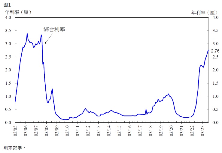 智通财经APP获悉,11月17日,香港金管局公布2023年10月底的综合利率。反映银行平均资金成本的综合利率在2023年10月底为2.76厘,较2023年9月底的2.68厘上升8基点。综合利率上升,反映月内存款的加权资金成本增加。