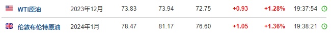 3. 截至发稿,WTI原油涨1.28%,报73.83美元/桶。布伦特原油涨1.36%,报78.47美元/桶。