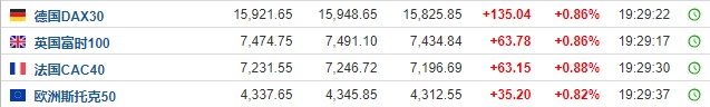 2. 截至发稿,德国DAX指数涨0.86%,英国富时100指数涨0.86%,法国CAC40指数涨0.88%,欧洲斯托克50指数涨0.82%。