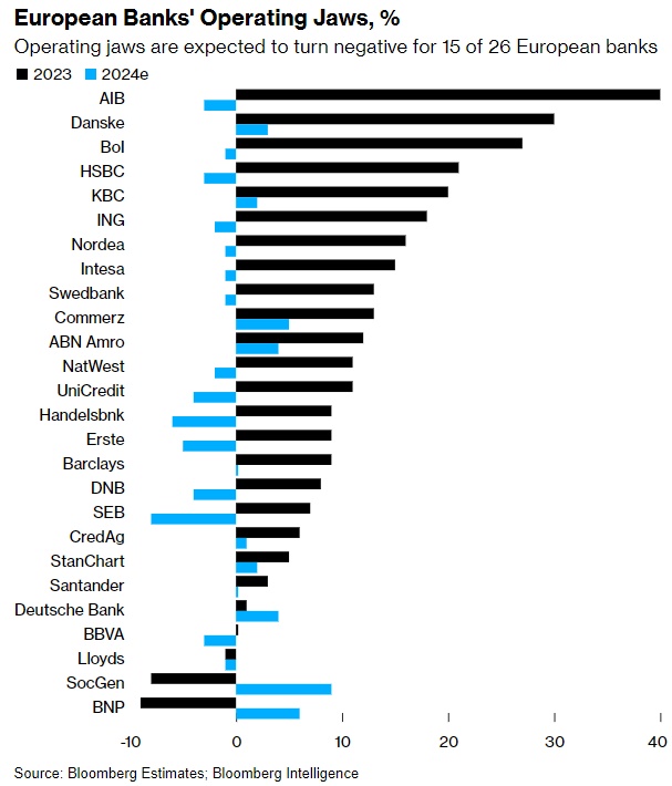 BI分析师Philip Richards和Mar 'Yana Vartsaba表示,预计到2024年,26家欧洲银行中有15家银行的Operating jaws(这是一项显示收入和成本增长之间差异的关键指标)将变为负值,今年仅有3家银行的Operating jaws为负。