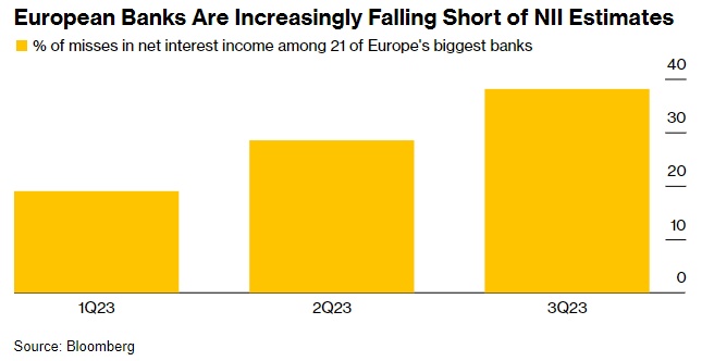 英国银行第三季度收益显示,随着抵押贷款和存款竞争加剧,净利息收入(NII)受到压力,高利率正成为一种负担。数据显示,在欧洲21家最大的银行中,上季度有38.1%的银行未能达到NII的预期,高于今年第一季度的19%。