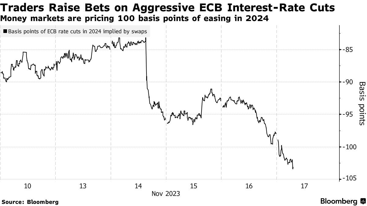 欧元区CPI急剧下滑,加之该地区多数国家经济不景气导致交易员们押注欧洲央行明年的降息步伐会加快。欧洲货币市场的交易员们首次完全定价2024 年欧洲央行大约达100个基点的降息幅度。而就在两个月前,根据与 2024 年相关的掉期定价数据,交易员们普遍预计欧洲央行将降息不到 75 个基点。
