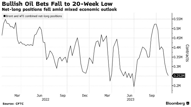 洲际交易所和美国商品期货交易委员会的数据显示,截至 11 月 14 日当周,基金经理将布伦特原油和西德克萨斯中质油看涨押注减少 18,829 手,净多头头寸合计达到252,261 手,为 6 月 27 日以来的最低水平。
