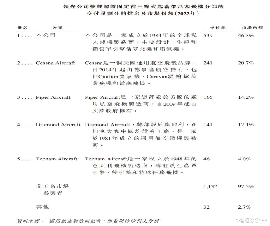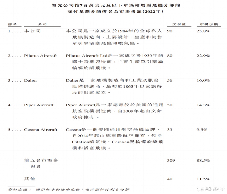 愿景喷气机针对私人航空业的不同及更高端市场,提供显著增强的性能、能力和规格,价格也较高。愿景喷气机通常最多可承载五名成年人和两名儿童。根据通用航空制造商协会的资料,自愿景喷气机于2016年首次交付以来,其已连续五年成为700万美元以下最畅销的喷气机。根据弗若斯特沙利文的资料,按2022年交付量计,愿景喷气机占700万美元及以下单涡轮增压飞机分部市场份额的25.8%。