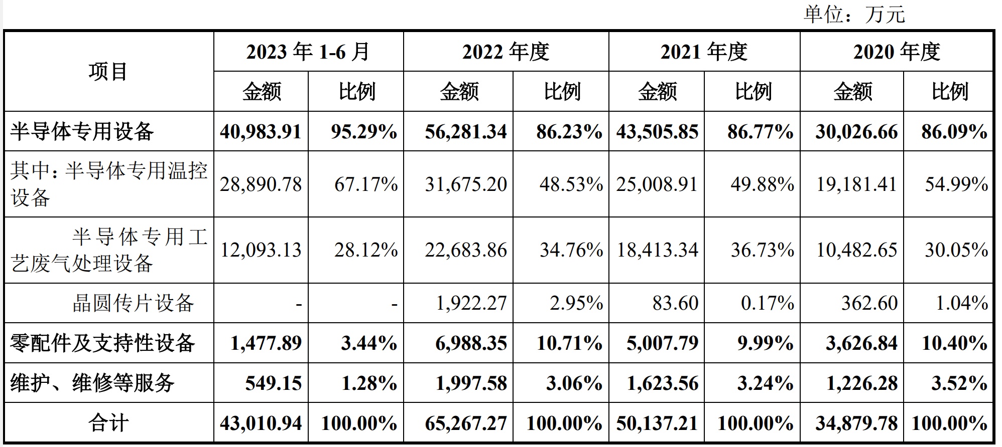 据招股书,京仪装备主要从事半导体专用设备的研发、生产和销售,主营产品包括半导体专用温控设备(Chiller)、半导体专用工艺废气处理设备(LocalScrubber)和晶圆传片设备(Sorter)。公司自成立以来,主营业务未发生重大变化。