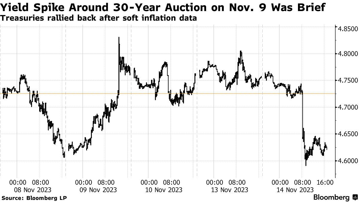 尽管如此,11月9日的30年期美国国债拍卖中仍然取得了远高于预期的国债收益率,这一需求疲软的迹象引发了当天美债市场的阶段性抛售浪潮。但事实证明,这种低迷价格趋势是短暂的,投资者纷纷从高收益率获利,债券价格持续被推高,同时上周五美债收益率从约4.77%的起始水平降至4.56%阶段性低点。