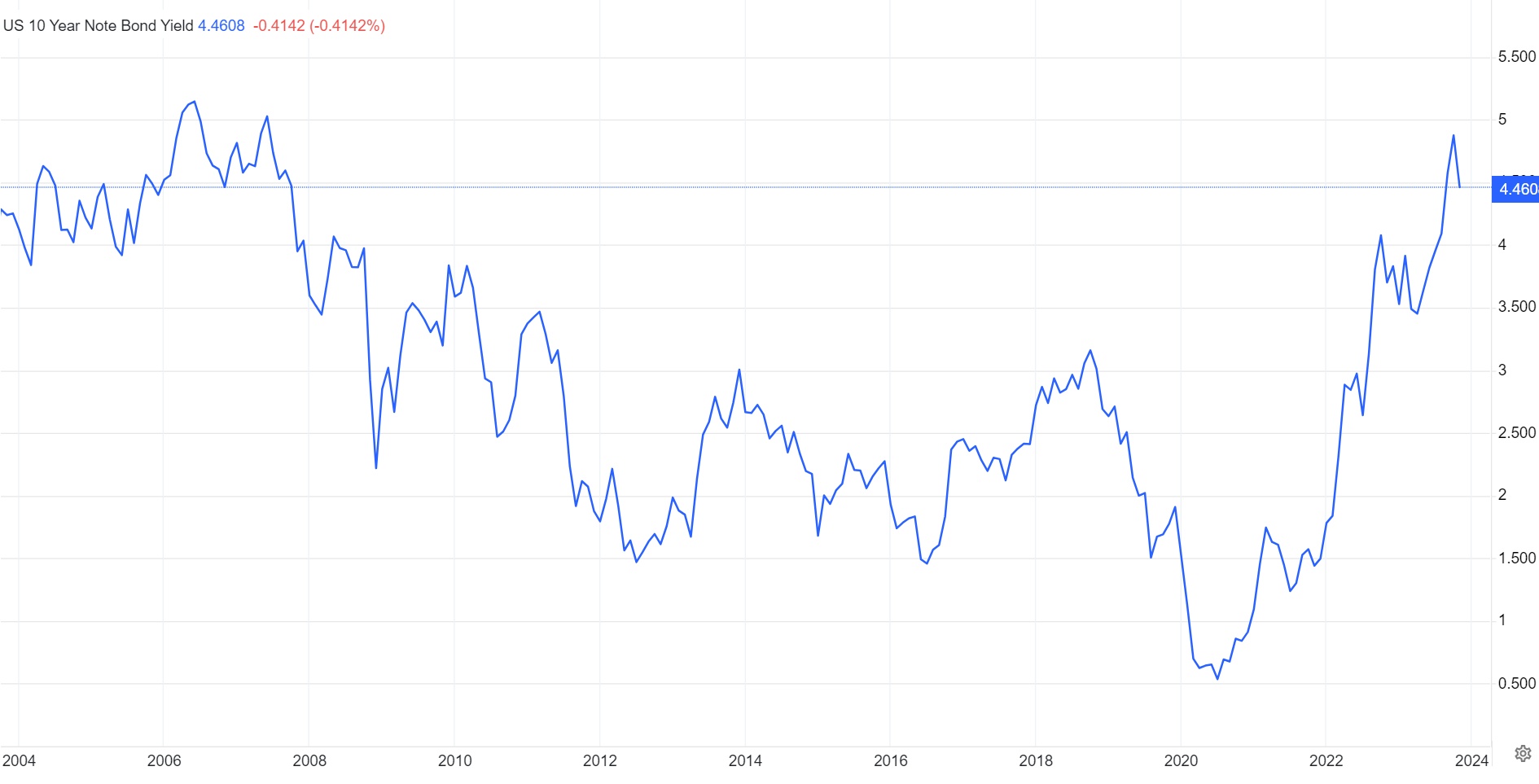 在强劲经济数据,以及不断升高的美国联邦赤字刺激下,有着“全球资产定价之锚”称号的10年期美债收益率在10月份一度狂飙超5%,一举创下2007年以来新高。美债收益率狂飙趋势使得美债多头们的投资组合损失惨重(美债价格变动与收益率变动呈现反向趋势),但是交易员们仍在几十年来最严重的美债熊市中寻找到一线希望——即较高的固定收益率为投资组合提供了更大的保护力度,以及美国经济放缓趋势下美债买盘有望愈发强大。