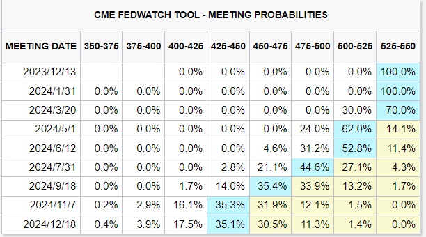 超预期降温的美国CPI和PPI,以及连续多周升高的美国续请失业金数公布之后,CME“美联储观察工具”显示,利率期货交易员们押注美联储加息周期已完结,对于美联储明年5月开始降息周期的预期迅速升温,押注自5月以来美联储将降息近100个基点。