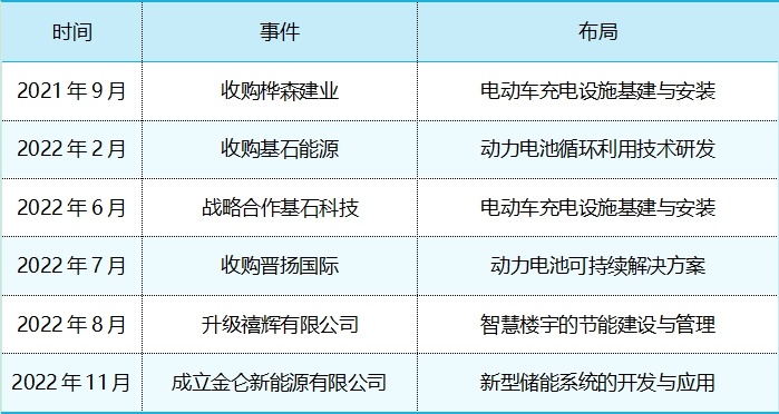 从时间线来看,在2021年9月至2022年11月短短14个月的时间中,晋景新能以“雷霆之势”做了六大布局,公司通过收购、战略合作、战略升级、成立新公司等多种方式,使其产品或服务延伸至了电动车充电设施基建与安装、动力电池循环利用、电动车电池可持续解决方案、绿色楼宇的节能建设和智慧管理、新型储能系统的开发利用五大领域或环节。