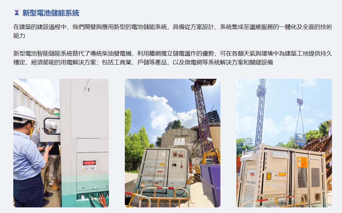 在智慧节能建设中,晋景新能在全面采用绿色设计和节能材料的同时,公司开发了新型的电池储能系统,这是传统柴油发电机理想的替代品,可为工地提供持久稳定、经济节能的用电解决方案,更大程度的实现建筑建设阶段的零碳排放。目前,晋景新能的电池储能系统已用于屯门黄金海岸、观塘鸿图道33号、元朗孖峰岭路、元朗大棠路等多个工地建设项目,后续公司将携手战略合作伙伴,将公司研发的新型电池储能系统拓展至工商业、户储、微电网、电动车充电场等场景。