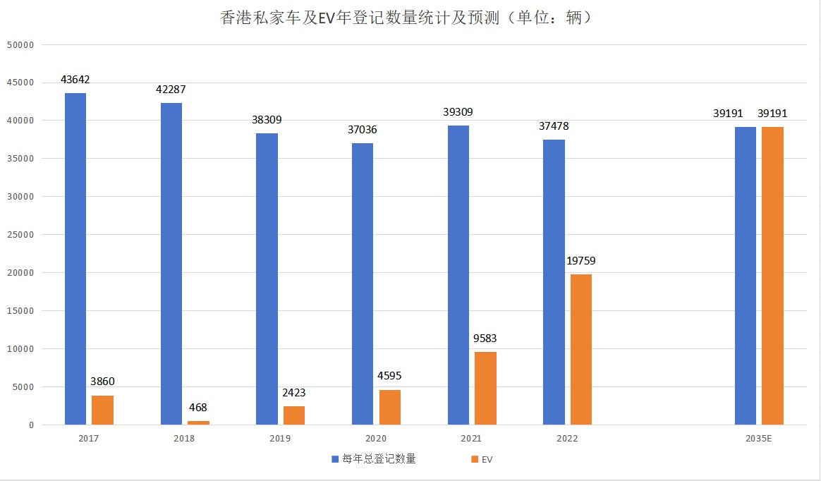 数据显示,香港电动私家车首次登记的数量占比从2019年的6.32%已飙升至2022年的52.72%,预计至2035年时,香港电动车首次登记的数量将增至近4万辆,相较2022年的约2万辆仍有近一倍的成长空间。而每年首次登记电动车数量的不断增多,将会带来庞大的充电需求,必须壮大电动车充电设施基建才能维持香港绿色运输的稳定性。
