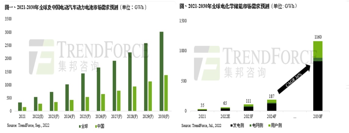 从产业角度而言,新能源电芯的处置与循环利用发展有着明显的紧迫性与必要性。据集邦咨询数据显示,至2030年,全球动力电池的新增装机量将超过3000 GWH,全球电化学储能的新增装机量将达到1160 GWH,那么从2022年至2030年,全球动力电池与电化学储能的新增装机量的年复合增速分别为24.57%、43.37%,这将带动大规模的电芯需求。