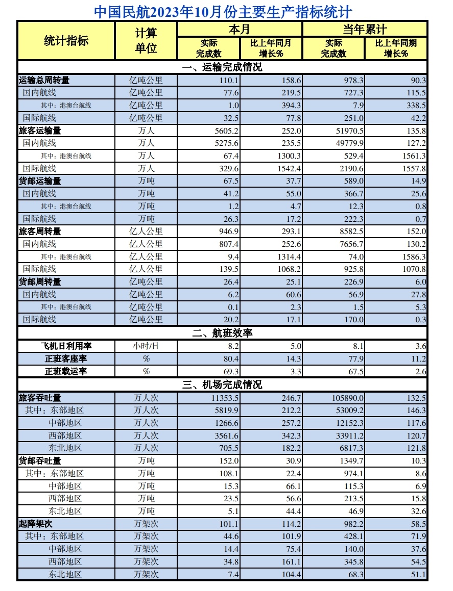 智通财经APP获悉,11月20日,民航局发布10月份主要生产指标统计显示,今年10月,运输总周转量达到110.1亿吨公里,同比增长158.6%;中国民航旅客运输量达到5605.2万人,同比增长252%,当年累计运输量已达5.2亿人;10月货邮运输量为67.5万吨,同比增长37.7%。