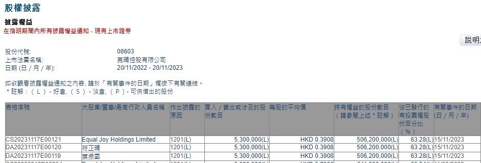 智通财经APP获悉,香港联交所最新资料显示,11月15日,Equal Joy Holdings