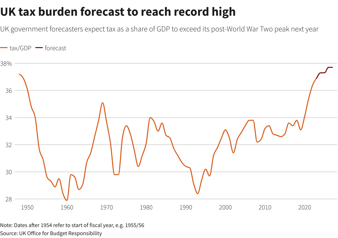 英国人的税收负担已经急剧上升。英国政府预算责任办公室(OBR)的数据显示,本财年税收收入占国内生产总值(GDP)的比例预计将达到37%,高于疫情前的33%左右,也是自1948年以来的最高水平。