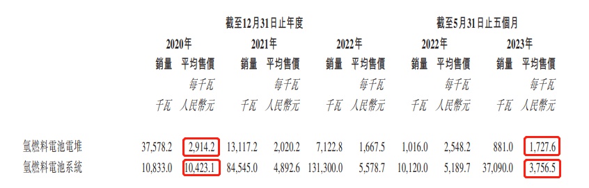 智通财经APP发现,国鸿氢能的氢燃料电池电堆的平均售价从2020年的2914.2元人民币/千瓦降至2023年5月31日的1727.6元人民币/千瓦,三年多时间降幅达40.7%;氢燃料电池系统的平均售价从2020年的1.04万人民币/千瓦降至2023年5月31日的3756.5元人民币/千瓦,三年多时间降幅63.96%。