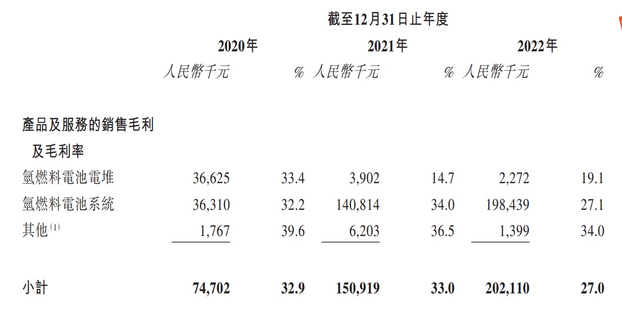 在平均售价随成本快速下降后,商业化提速明显,氢燃料电池系统的销量从2019年的8300千瓦增至2022年的13.13万千瓦,三年复合增速高达151%,这带动了国鸿氢能收入的快速提升,2020至2022年,公司的总收入分别为2.27亿、4.57亿、7.48亿元,年复合增速高达81.66%。