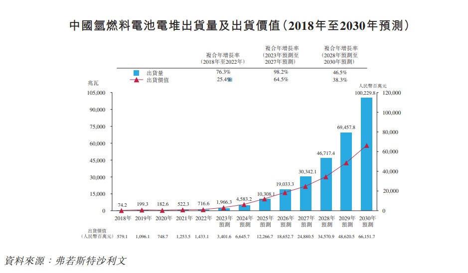 在国家政策的大力扶持下,再叠加行业商业化能力的持续提升,我国氢燃料电池行业有望步入高成长阶段。据弗若斯特沙利文数据显示,预期中国氢燃料电池电堆的出货量将保持快速增长,将由2023年的1,966.3兆瓦增至2027年的30,342.1兆瓦,复合年增长率约为 98.2%。于2030年前,中国氢燃料电池电堆的出货量将激增至100,229.8兆瓦,自2028 年至2030年的复合年增长率约为46.5%。中国氢燃料电池系统按销售量计的市场规模预期于2027年将达25,027.0兆瓦,2030年将达83,367.2兆瓦。自2023年至2027年的复合年增长率预期为99.2%。自2028年至2030年的复合年增长率预期为46.3%。按销售价值计,预期中国氢燃料电池系统的市场规模将由2023年的人民币6,199.5百万元增至2027年的人民币45,048.6百万元及2030年的人民币116,714.1百万元。显然,氢燃料电池是一个“长坡厚雪”的高成长赛道,前景广阔。