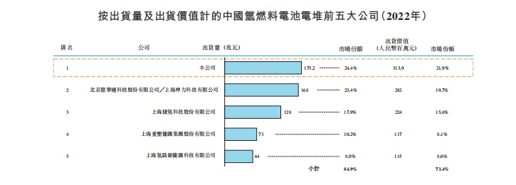 国鸿氢能是国内技术领先的氢燃料电池企业,据弗若斯特沙利文数据显示,按氢燃料电池电堆出货量计,国鸿氢能自2017年至2022年连续六年排名第一位。截至目前,国鸿氢能的氢燃料电池电堆的出货量已超过650兆瓦,在全国氢燃料电池商用车市场中,装载国鸿氢能产品的商用车保有量占比超50%。