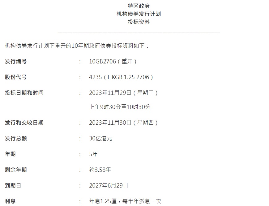 据悉,通过这次重开债券,将有额外30亿港元的未到期10年期债券(发行编号10GB2706)供投标。该批债券将于2027年6月29日期满,利率为年息1.25%,每半年派息一次。该批债券于2023年11月20日的指示价格为91.58,年收益率则为3.804%。